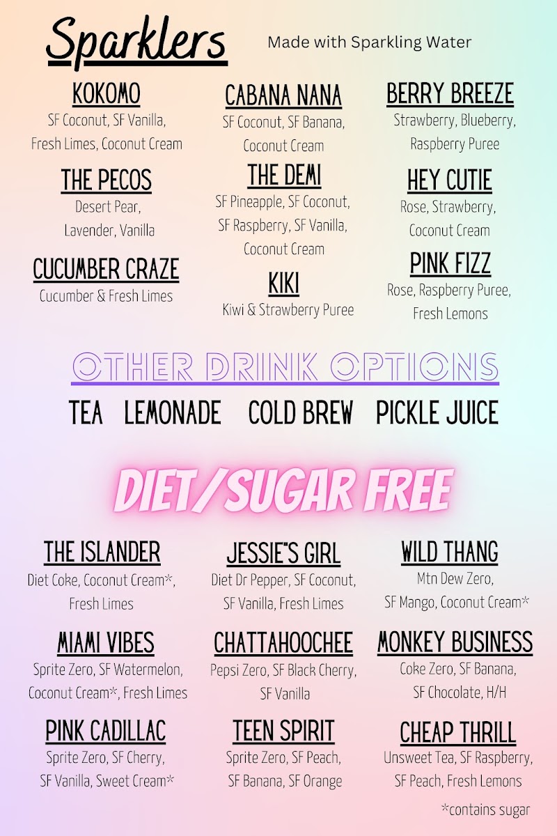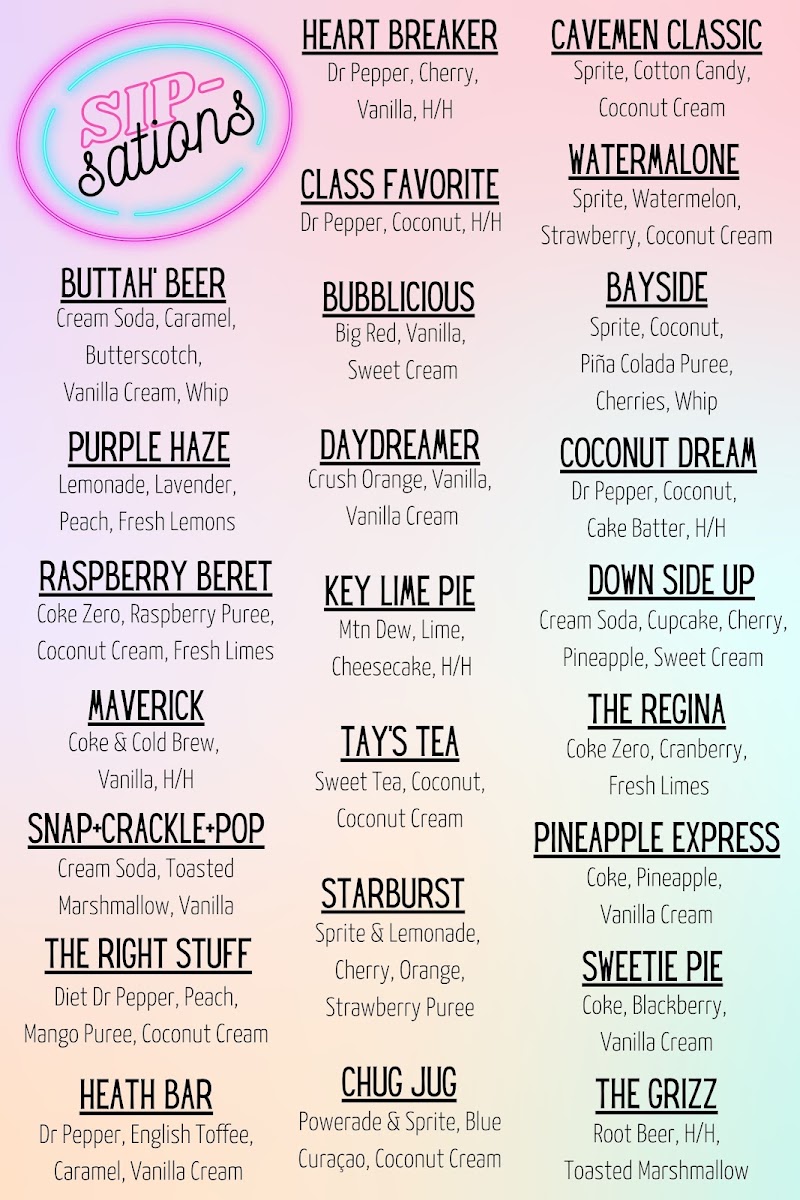 Sprite or Mt. Dew, Blue Razz, Cherry Lime, Coconut Cream, Fresh Limes