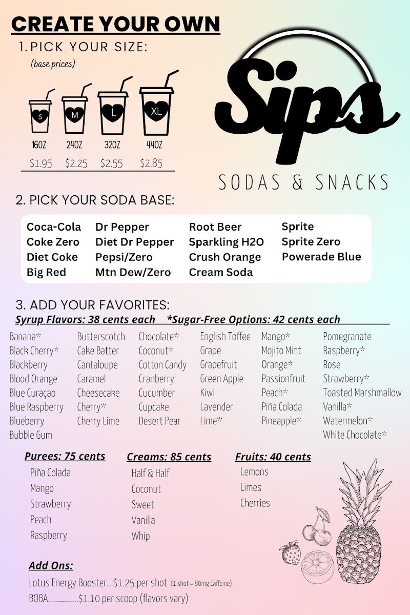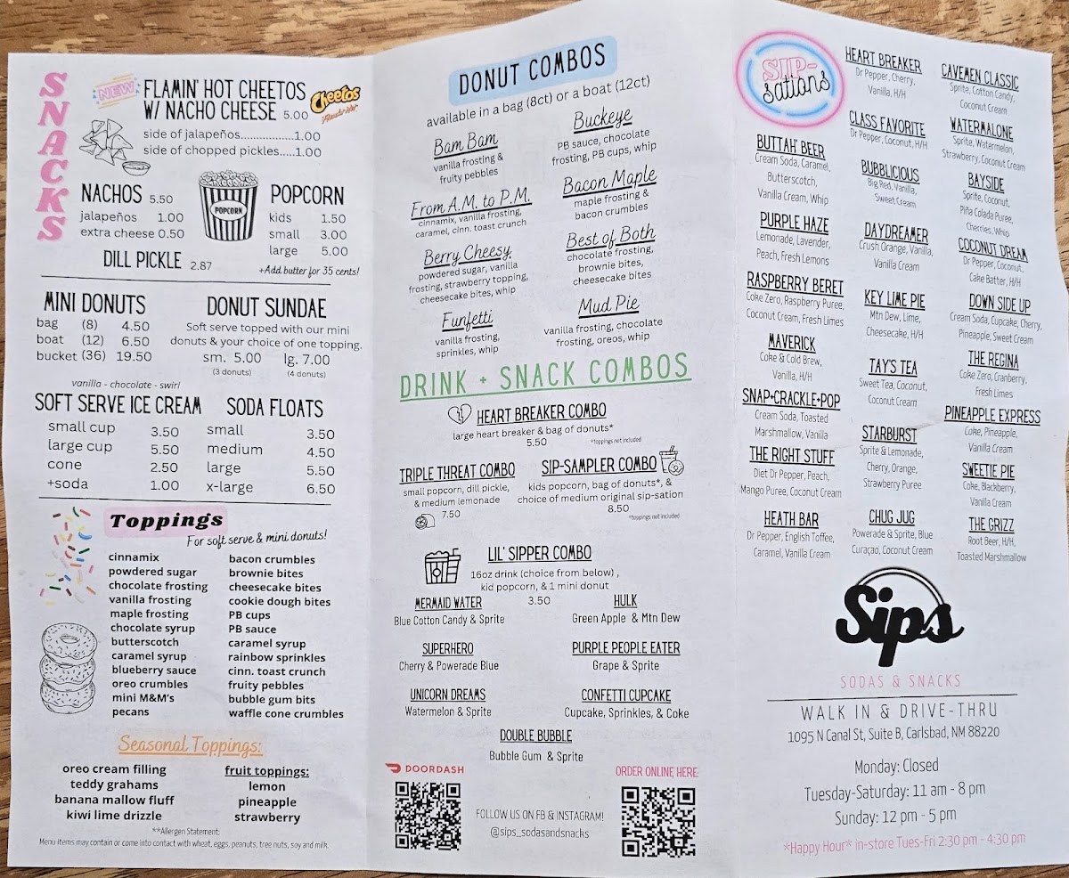 You’ll find the Sips Sodas & Snacks Menu packed with the kind of treats that make a quick stop feel like a little reward. Just off 1095 N Canal St in Carlsbad, it’s the sort of place where you can ease into the moment with an ice-cold specialty soda or a creamy shake that’s mixed to hit the spot. As you look through the lineup, you’ll notice plenty of fun flavor combos, along with snacks that balance sweetness and crunch in all the right ways.